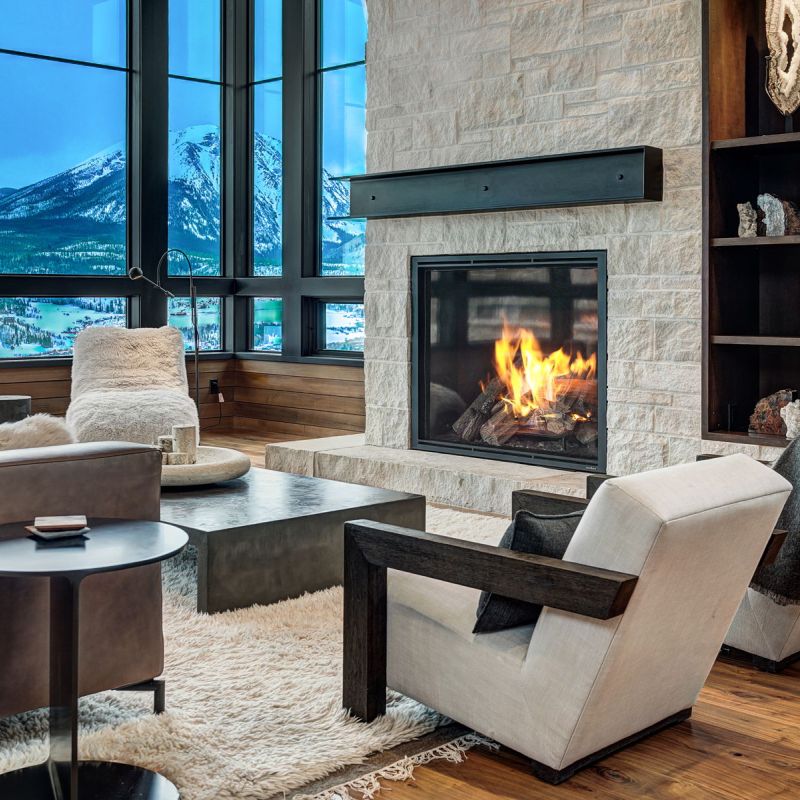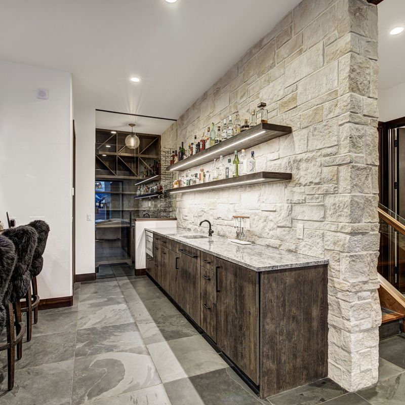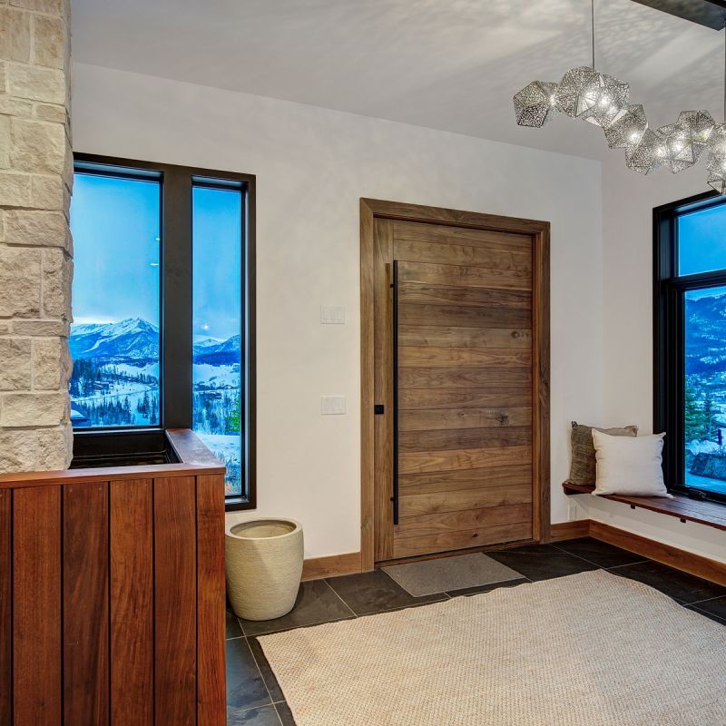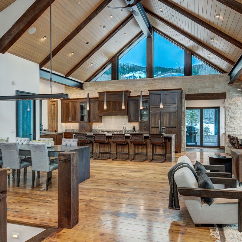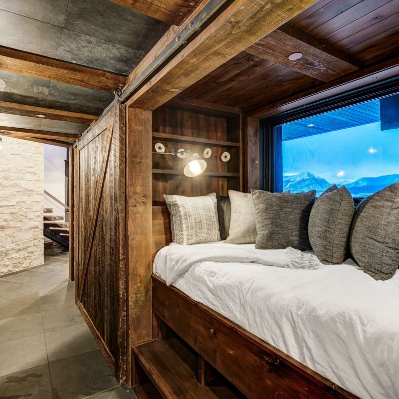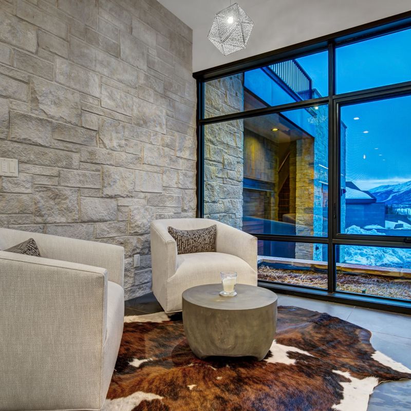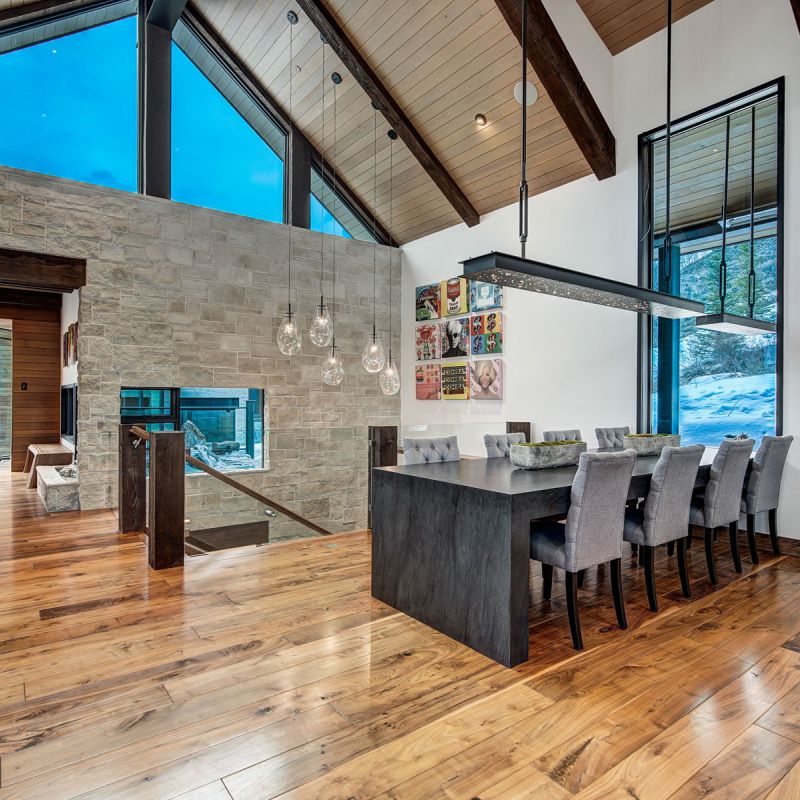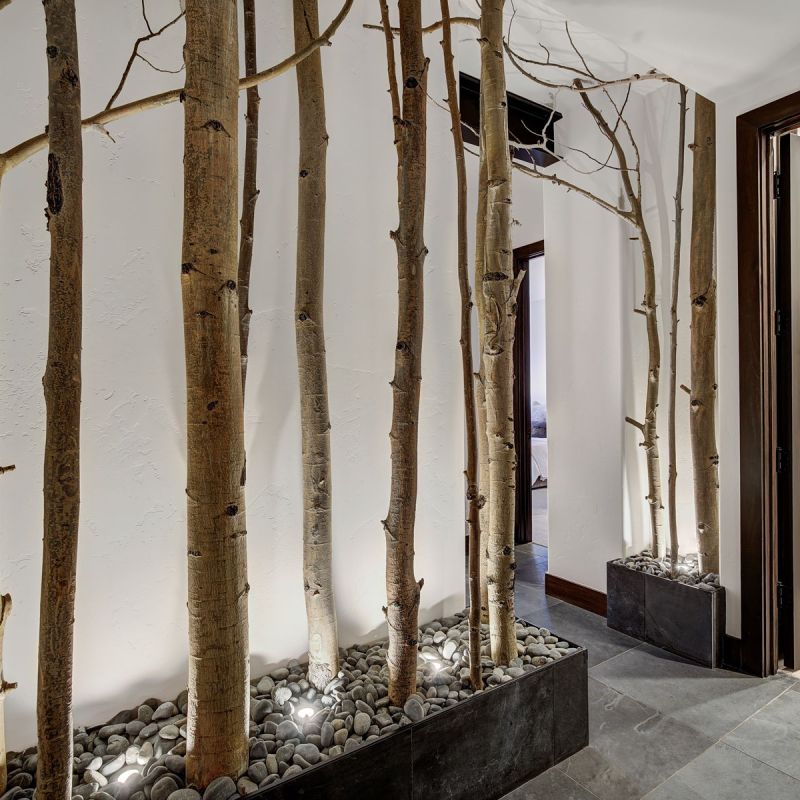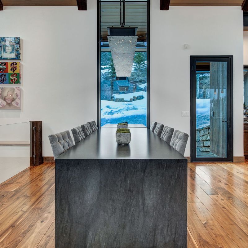 The home tells a story through its thoughtfully curated details. A custom dining room table extends outdoors, inviting alfresco dinners under a star-filled sky. The slate tunnel, an homage to the natural terrain, leads to a secluded space where the sound of the waterfall provides a soothing retreat. Additionally, a wall of aspens within the home evokes the sensation of walking through a forest, enriching the connection to the landscape.