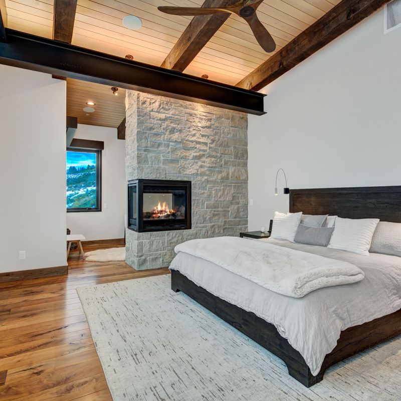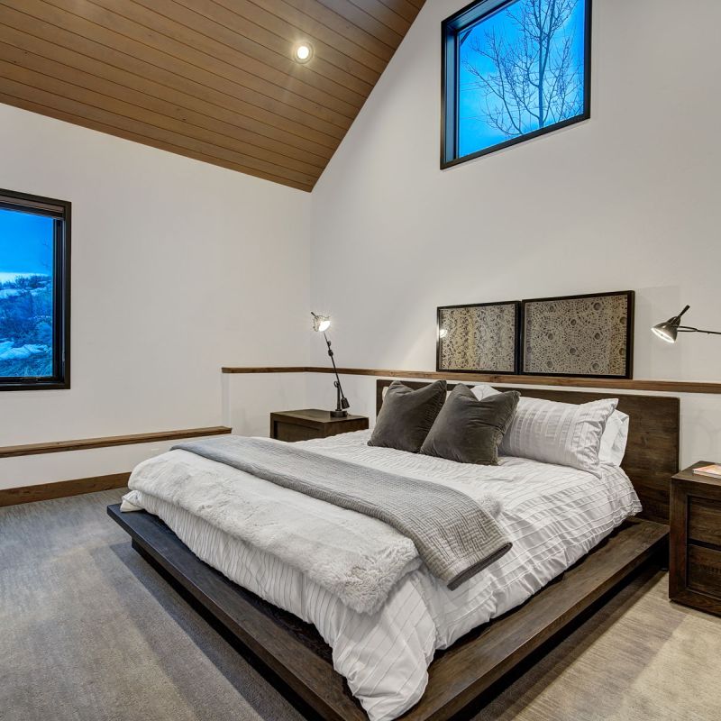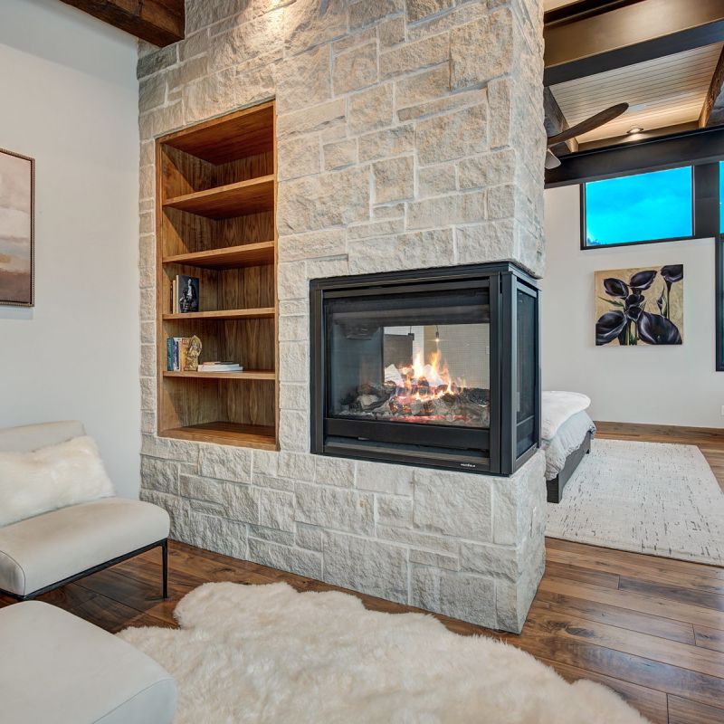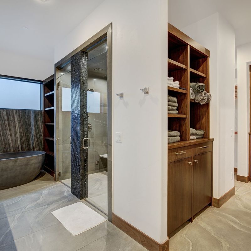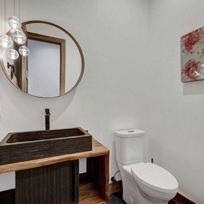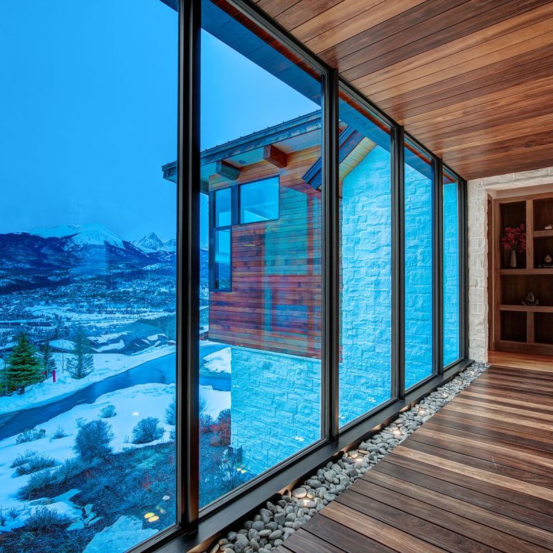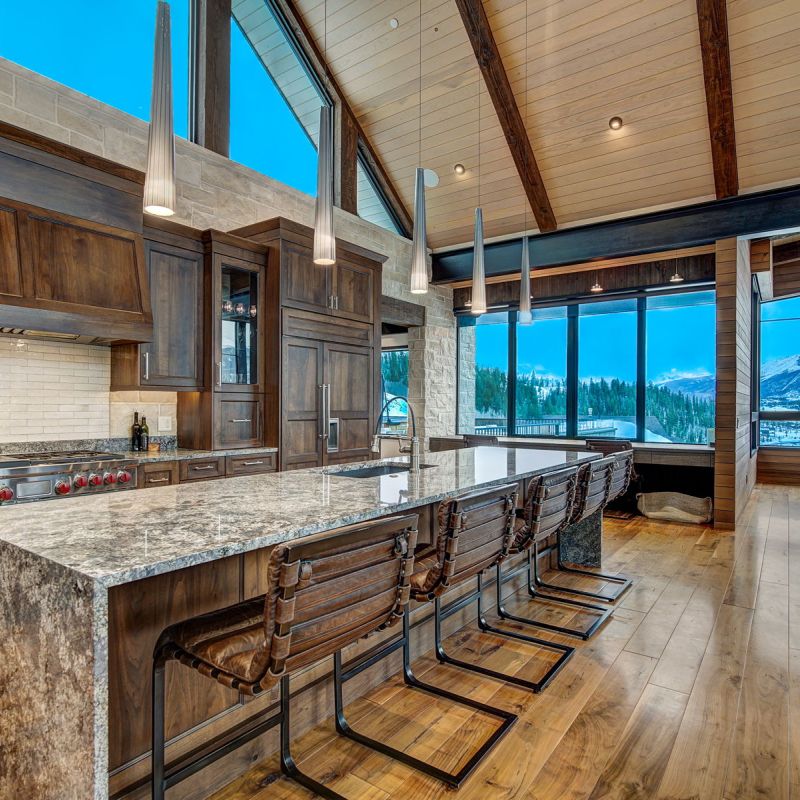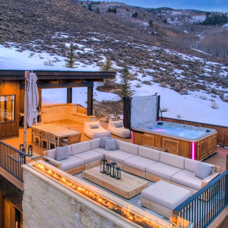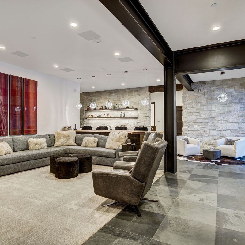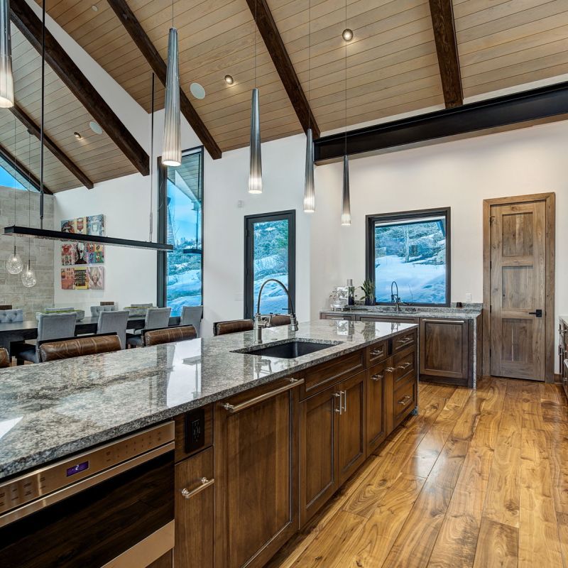 The home tells a story through its thoughtfully curated details. A custom dining room table extends outdoors, inviting alfresco dinners under a star-filled sky. The slate tunnel, an homage to the natural terrain, leads to a secluded space where the sound of the waterfall provides a soothing retreat. Additionally, a wall of aspens within the home evokes the sensation of walking through a forest, enriching the connection to the landscape.